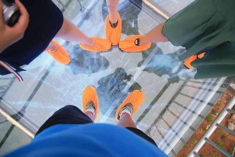金鸡岩玻璃桥长约130米,桥高约30米,宽2米。特效三层爆裂玻璃,3D玻璃桥+5D破裂效果。3D画面直接镶嵌在玻璃中,各种自然美景如被踩在脚下,一会是深渊、一会是瀑布、一半是海水、一半是火焰。