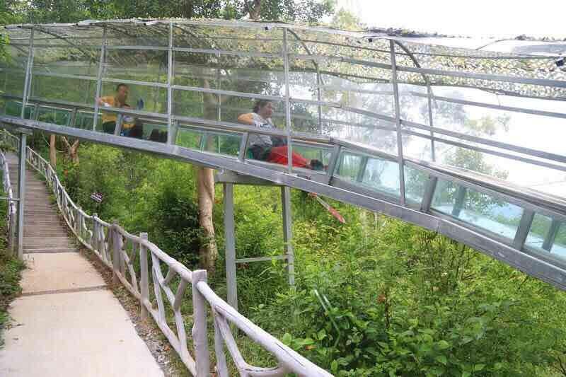 金鸡岩景区还打造了一条令人“惊悚”的玻璃滑道,滑道全长400多米,从上面滑下来,风呼咻呼咻的吹过,刺激异常。