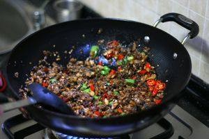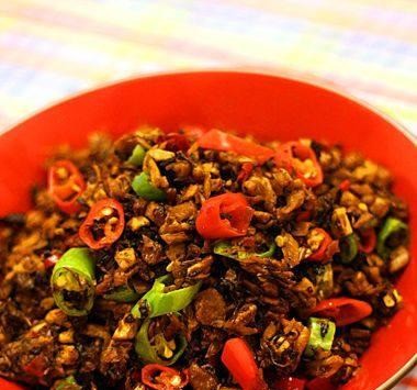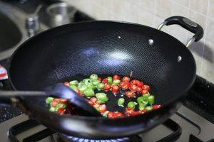 油锅烧热,下入朝天椒炒香
