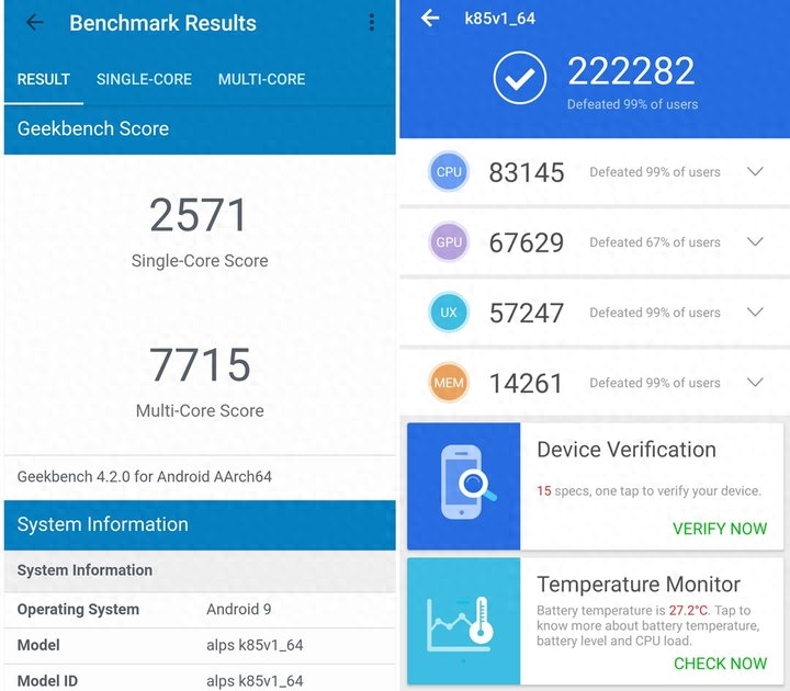 ▲ 联发科 Helio G90T 跑分,左为 GeekBench,右为安兔兔
