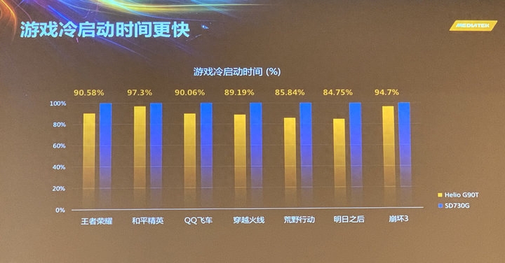 游戏启动时间上也是,联发科表示 G90T 手机上的游戏冷启动时间平均大概是骁龙 730G 手机的 90% 左右。