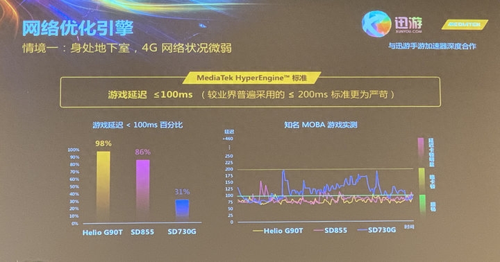 比如这个典型的地下室环境下,在 Hyper Engine 技术的加持下,G90T 手机的网络延迟 98% 的时间在 100ms 以下,一般来说 100ms 以下的网络延迟就能保证较好的流畅体验了,而隔壁骁龙 855 和骁龙 730G 的表现就要差很多了。
