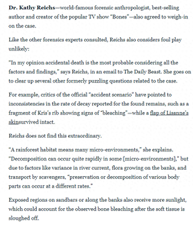还有根据案件的新闻稿也表明,法医小组也认为最可能的结果就是在小径附近卷入了一起致命的意外事故。