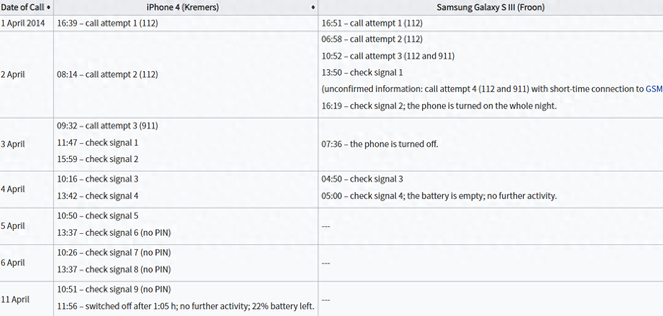 第一通电话是由克莉丝的iPhone 4在下午4:39分拨出,随后莉莎娜的三星手机于下午4:51分拨出一通报警电话。不过遗憾的是,二人拨打的电话因为信号不好,没有拨通。除了一通于4月3日拨给911的电话,但该通电话在接通后一秒左右即失去信号。4月5日上午5:00,莉莎娜的手机电力耗尽,此后没有在使用过。而克莉丝的iPhone 4也在这期间没有再拨出任何电话,但曾多次短暂地开启手机以搜寻讯号。4月6日后,克莉丝的iPhone 4多次输入错误的手机密码,而且使用者始终没能输入正确的密码。此外,4月7日至10日之间,iPhone 4有多达77次的紧急通话纪录。iPhone于4月11日上午10:51最后一次被开启,并于约一个小时后的11:56关机,此后未再开启。