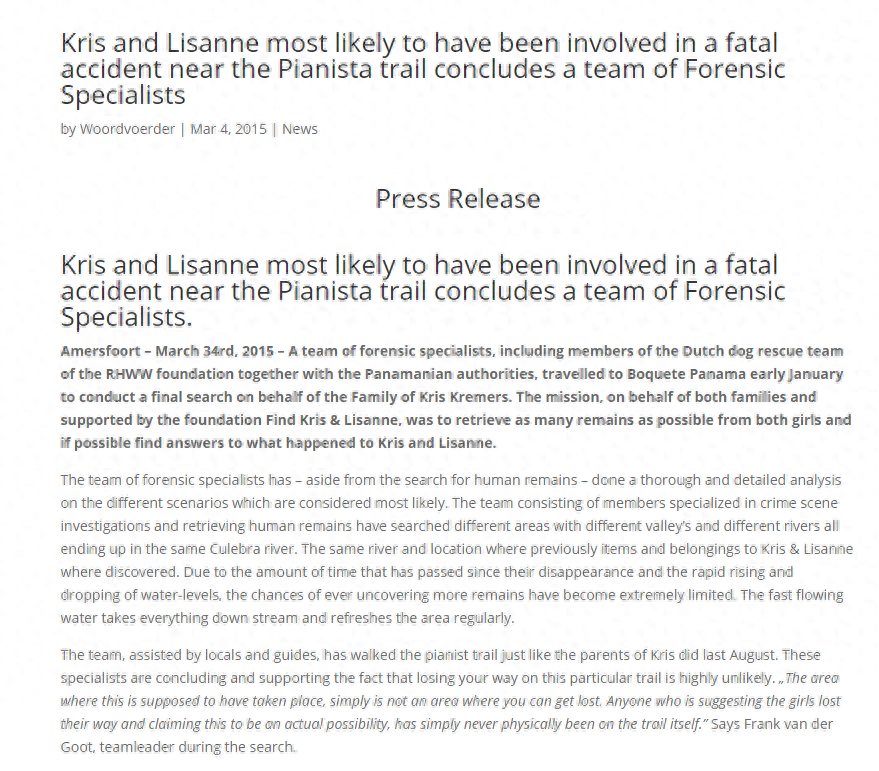 4月3日,当局开始对森林进行空中搜索,当地居民也开始搜索。4 月 6 日,两位女孩的父母与来自荷兰的警察、侦探一起抵达巴拿马,对森林进行了为期十天的全面搜索。但是依然毫无所获。