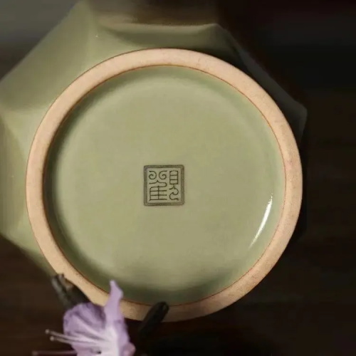 瓶身八棱形,肩部丰挺;腹部渐收,隐有筋骨之感;圈足微外奢,底部钤印“觀”字款识。