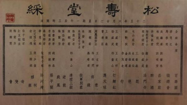 这张 1936 年的老戏单中既有梨园名角又有名票。然,它的“防伪标识”却令今日的读者颇感新奇,也是这张老戏单的价值所在,在“松寿堂彩”字后有 DOCNWELL 水印。本场堂会的主人是久居上海的陈夔龙老先生。为给这位陈老先生祝寿,陈府年年必办堂会,而人选全凭交谊及提调者的面子。陈夔龙乃清光绪丙戌年进士,以江苏巡抚升补四川总督,旋又调任湖广,直至出任直隶总督,可谓一帆风顺,官运亨通。晚年,其称病养于上海租界内,从此就以逊清遗老的身份做起了寓公。陈府坐落于上海孟德兰路(今江阴路),坐南朝北为半中半西式楼房,大厅前的院子可搭台演戏。