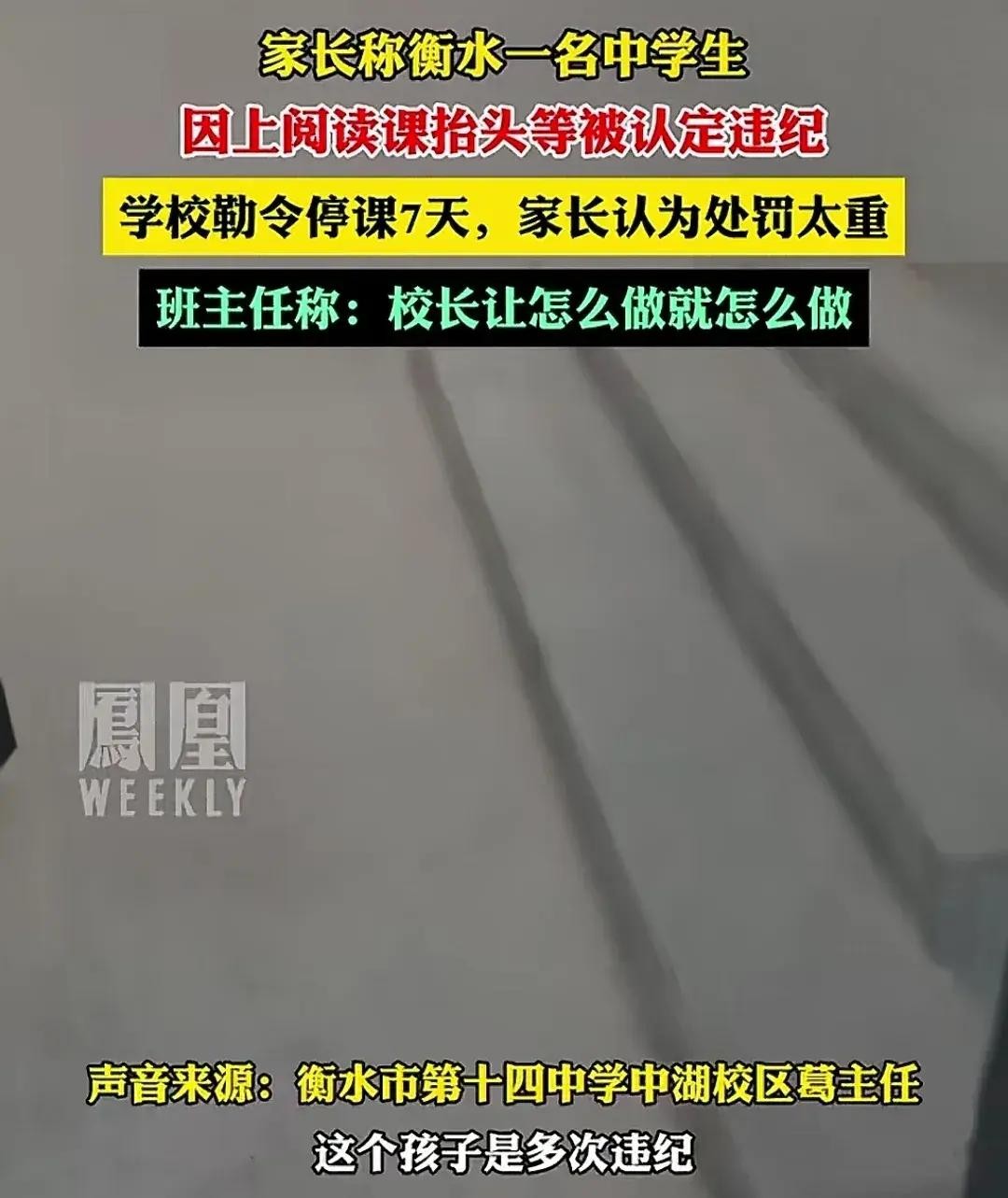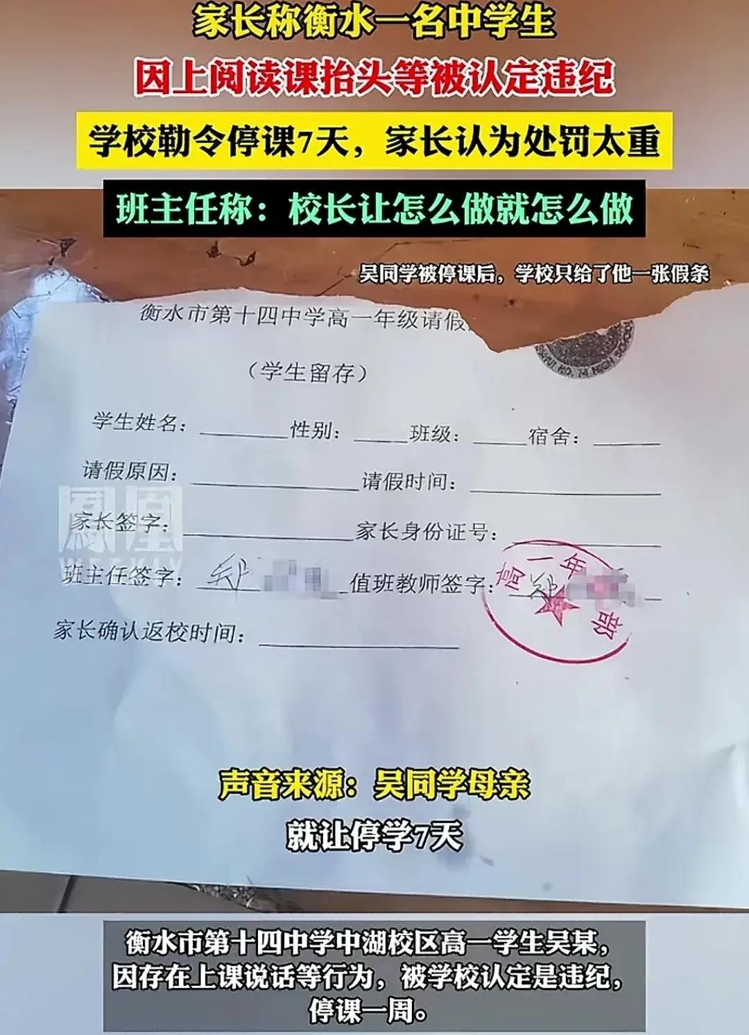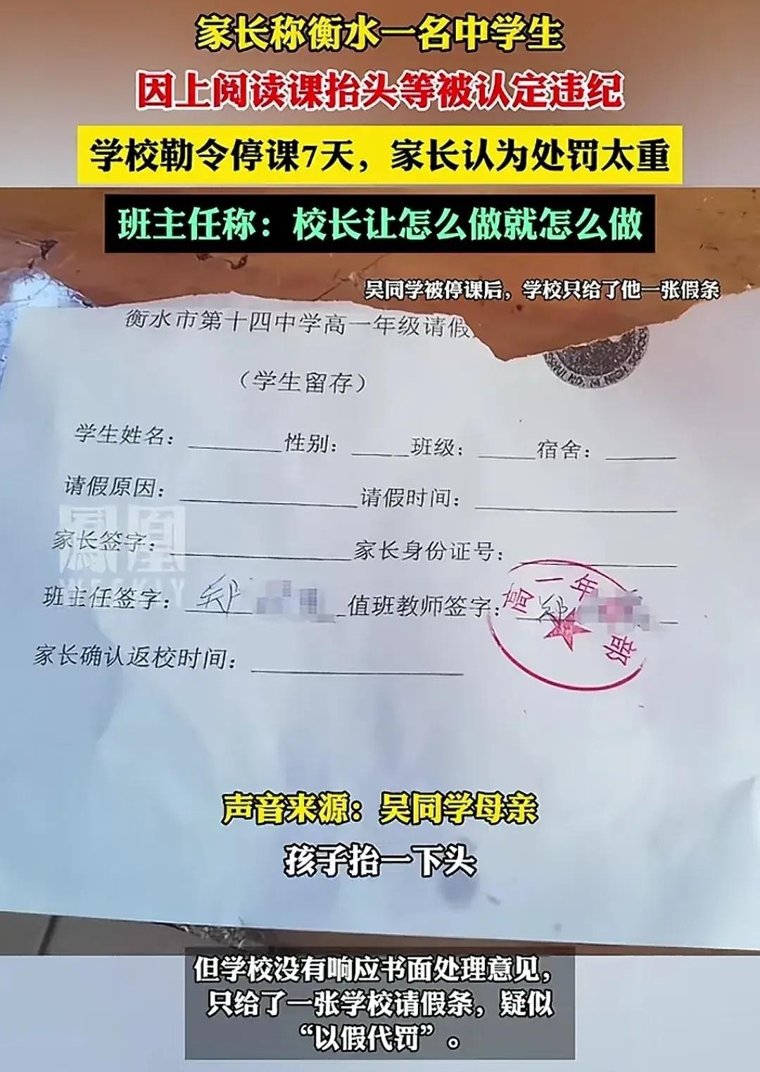 在我们的印象中,学校应该是一个传播知识、启迪智慧的神圣殿堂。然而,最近发生在衡水第十四中学的一起事件,却让无数人大跌眼镜。一名品学兼优的高一学生,仅仅因为在阅读课上抬了一下头,就被学校勒令停课七天。这一消息一经曝光,立即在网上引起了轩然大波。