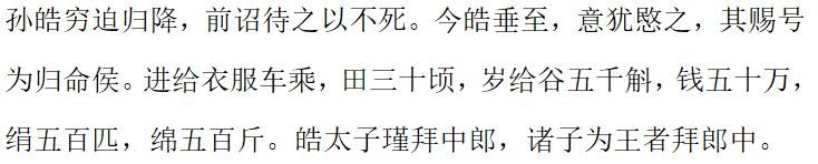 孙皓投降后也是被迁往洛阳。到了洛阳后,晋司马炎封他为归命侯,让他在洛阳生活。对他的赏赐是 “进给衣服车乘,田三十顷,岁给谷五千斛,钱五十万,绢五百匹,绵五百斤”。这与有食邑万户的刘禅,曹奂相比,待遇差距就较大了,而且还没有封地。不过在某种程度上来讲也算得上衣食无忧了。