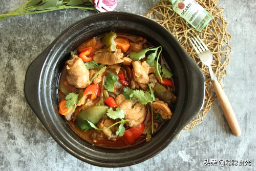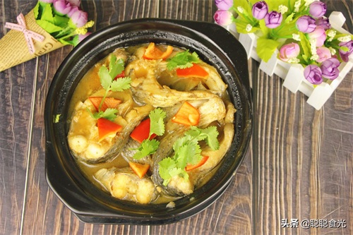 8、盖上砂锅盖子,小火炖半个小时左右,就可以出锅了,加了啤酒之后,鱼肉很嫩滑,肉质鲜美,完全没有腥味,香芹和青椒,洋葱等青菜的香味全部融入汤汁中,汤汁很鲜,可以泡饭吃。