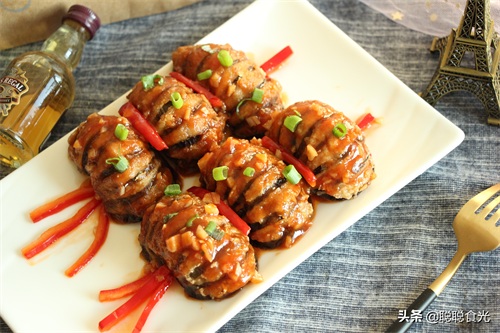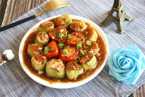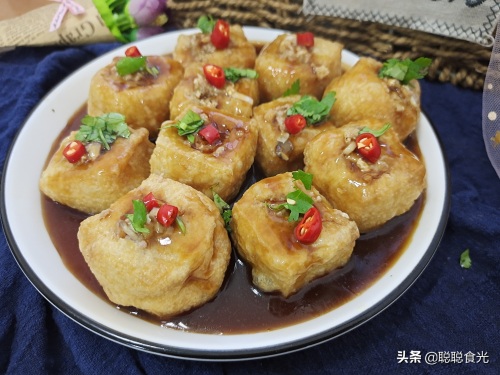 4、把熬好的料汁淋到蒸熟的油豆腐肉馅上面,撒点葱花,就可以了。