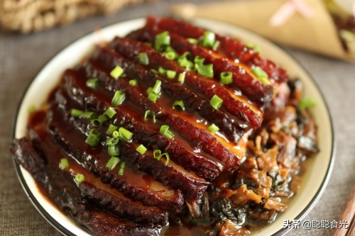 14、把剩下的腌肉料汁倒入锅里,加入适量水淀粉,熬到浓稠,淋在扣肉上面,表面撒葱花装饰一下就好了。