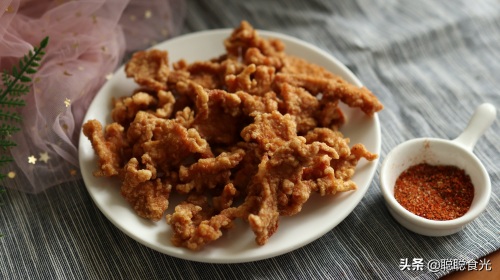 6、接着把油烧至8成热,再把肉片放入油锅中复炸一下,炸到表面金黄酥脆就可以捞出来了。