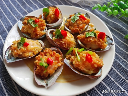做法:1、准备6只鲍鱼,处理好内脏,清洗干净后,把鲍鱼壳摆入盘中,在鲍鱼肉上划上花刀,然后摆入鲍鱼壳中。