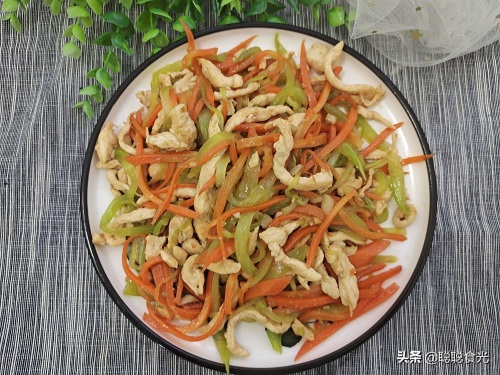 4、把胡萝卜丝放入鸡丝中,炒至胡萝卜微微变软。