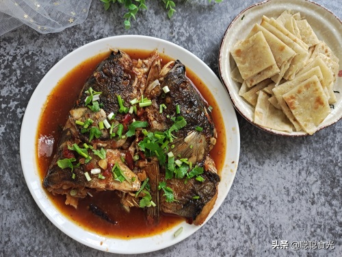 21、鱼头炖好之后,盛入盘中,再把汤汁收浓稠一点,倒入盘中,吃的时候趁热把饼泡在汤汁里面,或者用饼蘸汤吃就可以了。
