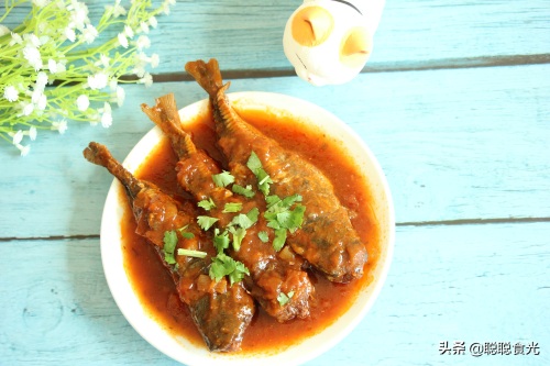 7、把沙丁鱼和番茄汤一起倒入高压锅中,高压锅上汽后炖一个小时左右。炖好之后关火,让沙丁鱼在汤汁中浸泡一天,充分吸收汤汁的味道,吃的时候把沙丁鱼盛入盘中。
