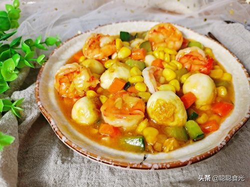 5、将腌制好的鱼丁倒入锅中炒熟。倒入之前准备好的熟玉米粒,熟豌豆粒,胡萝卜丁。