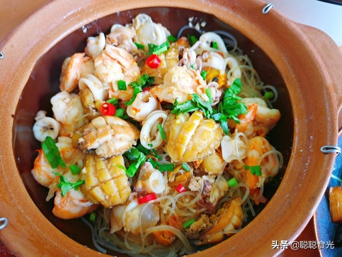 7、拌匀后先把粉丝捞出来,放在砂锅底部,然后再把海鲜摆在上面就可以了。表面撒小米椒圈、葱花和香菜末装饰。