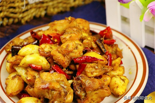 6、下入炸好的鸡块和大蒜,淋入一点点生抽,翻炒到鸡块吸收孜然和干红辣椒的味道,再把鸡块炒得干一点,就可以了。