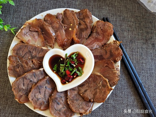 9、把切好的肉片放入碗中,加入之前调好的料汁,放上葱姜八角香叶等,用手抓拌均匀,腌制一个小时,让肉片充分吸收料汁。