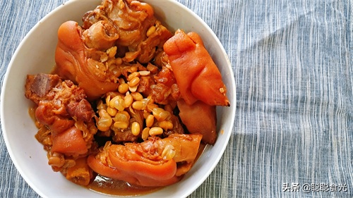 10、随着汤汁收干,猪蹄颜色会越来越红润,直到表面变得红润光亮,出锅摆盘,撒葱花装饰,就可以了。