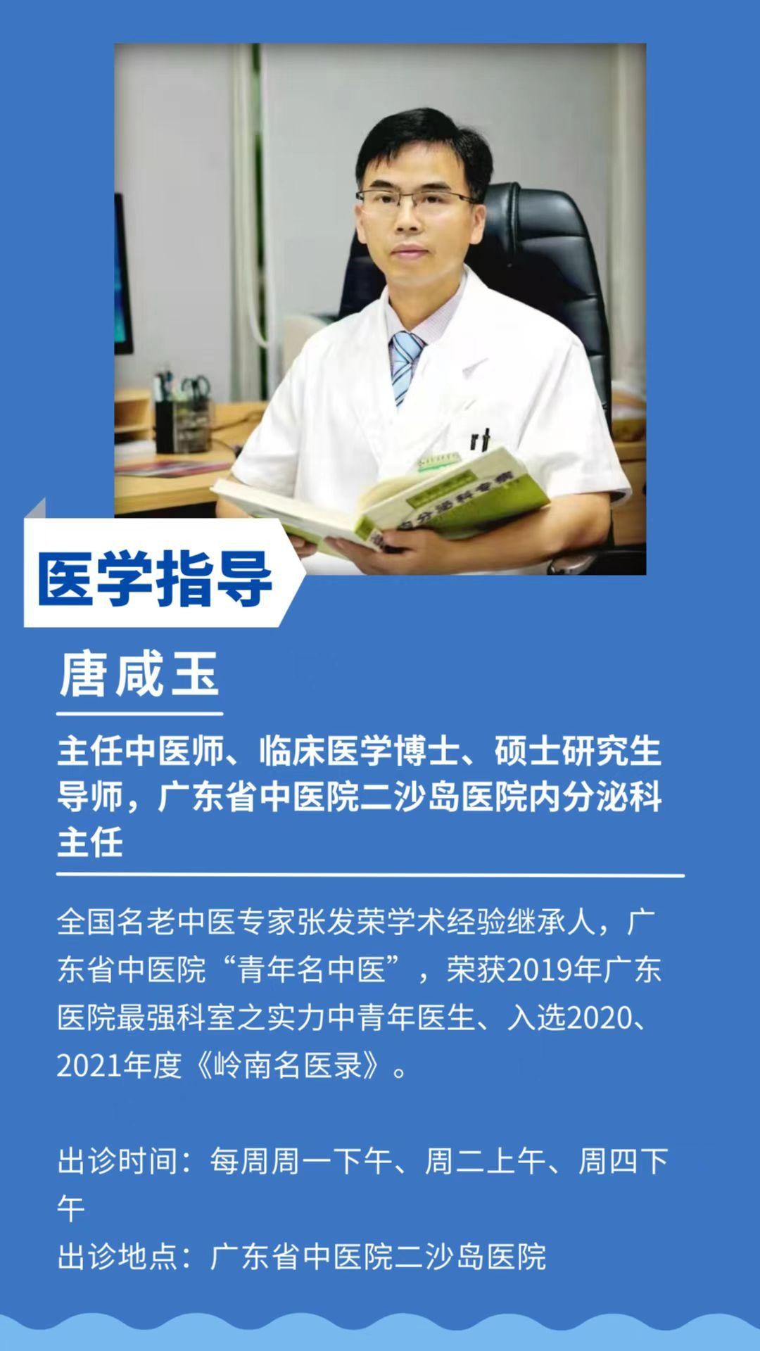 做糖尿病的管理达人,当内分泌疾病的调理师。“糖大夫讲堂”由广东省中医院二沙岛医院内分泌科唐咸玉专家团队主讲,带您走近内分泌世界,为您科普内分泌代谢性疾病中西医防治知识,分享临床诊疗小故事。为健康助力,为生活增彩。