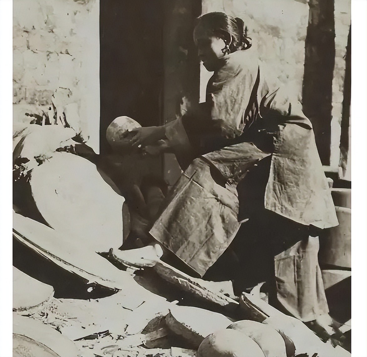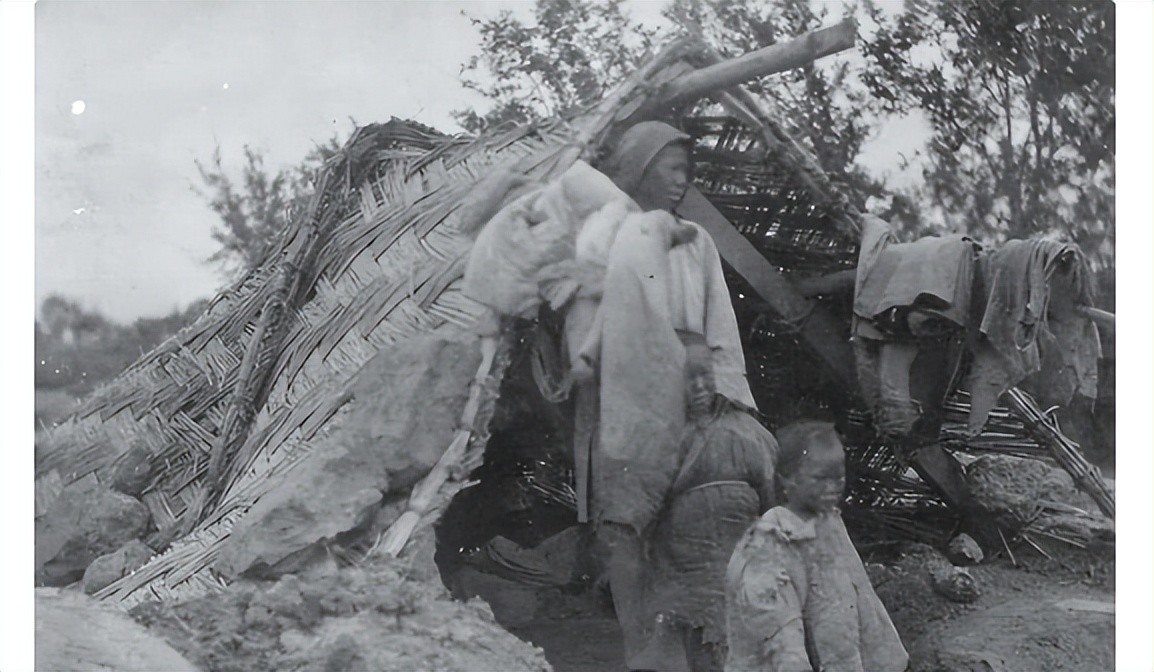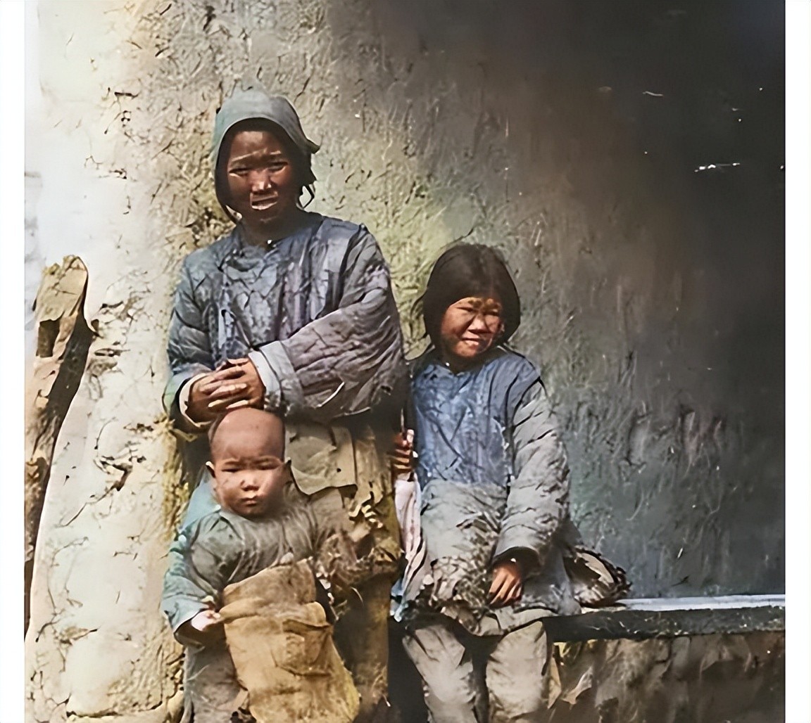 5.衣衫破旧不堪的母子三人,身后的背景暴露了家里的穷苦生活条件。