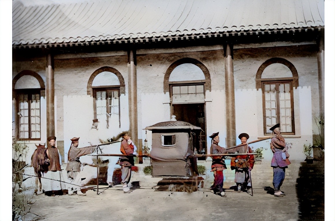 16.清朝时期,一名官员出行时的情景。四名轿夫抬着一顶轿子,在门口等候。还有骑马的随从。在清朝时期,只有三品以上的官员才有资格乘坐轿子。