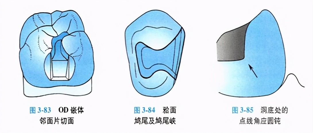 3)辅助固位形:对拾面嵌体而言,洞形外展不超过6°,洞形的高度在2mm以上,固位良好。邻拾嵌体除拾面洞形外,其邻面箱形增加了3—4个轴壁,也具备一定抵抗抬向脱位的固位力。除此之外,牙合龈向就位的嵌体,还需在功能状态下有抵抗邻向脱位的辅助固位形,如邻面片切面(图3—83)、拾面鸠尾(dovetail)及鸠尾峡(isthmus)(图3—84)、针形、沟形等辅助固位形,以辅助某些固位力不足的洞形增加某一方向的固位力。