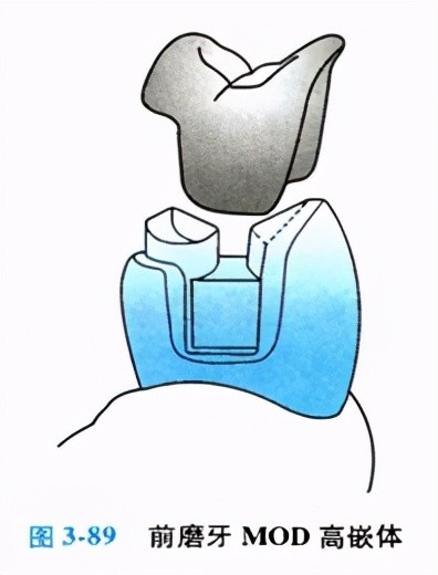 (1)后牙的多面嵌体,特别是前磨牙采用MOD嵌体往往牙折风险较大,因此更多采用MOD高嵌体(图3—89)。