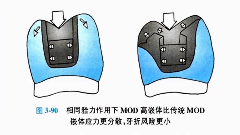 (1)优点:高嵌体牙合面被修复体覆盖,牙壁的受力将由嵌体时的拉应力改为压应力,可大大降低牙折的风险(图3-90)。