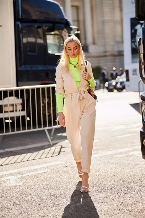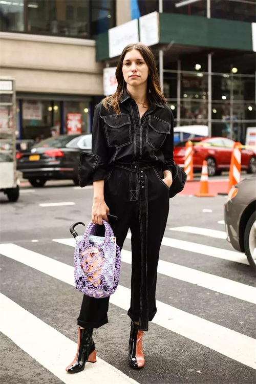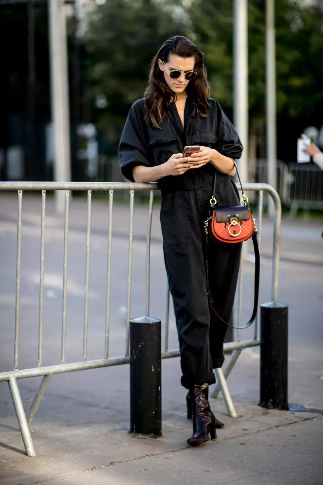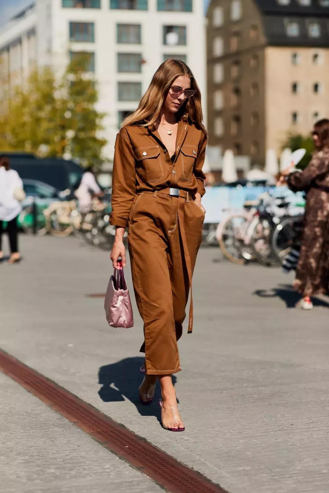 口袋少一点的连体工装裤很适合通勤来穿,给人干净利落的感觉。