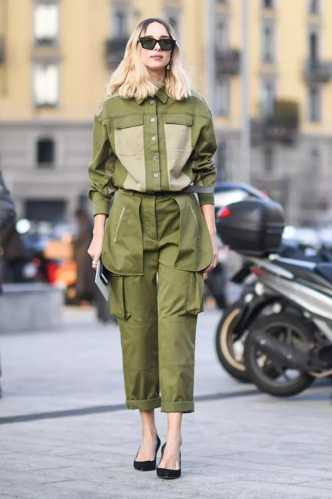 大多工装裤都是以军旅风格为主,在颜色上,比肤色深几个度的款式会更显白;上图的九分裤露出脚踝,在春夏季看起来比下图会更透气更时髦一些。