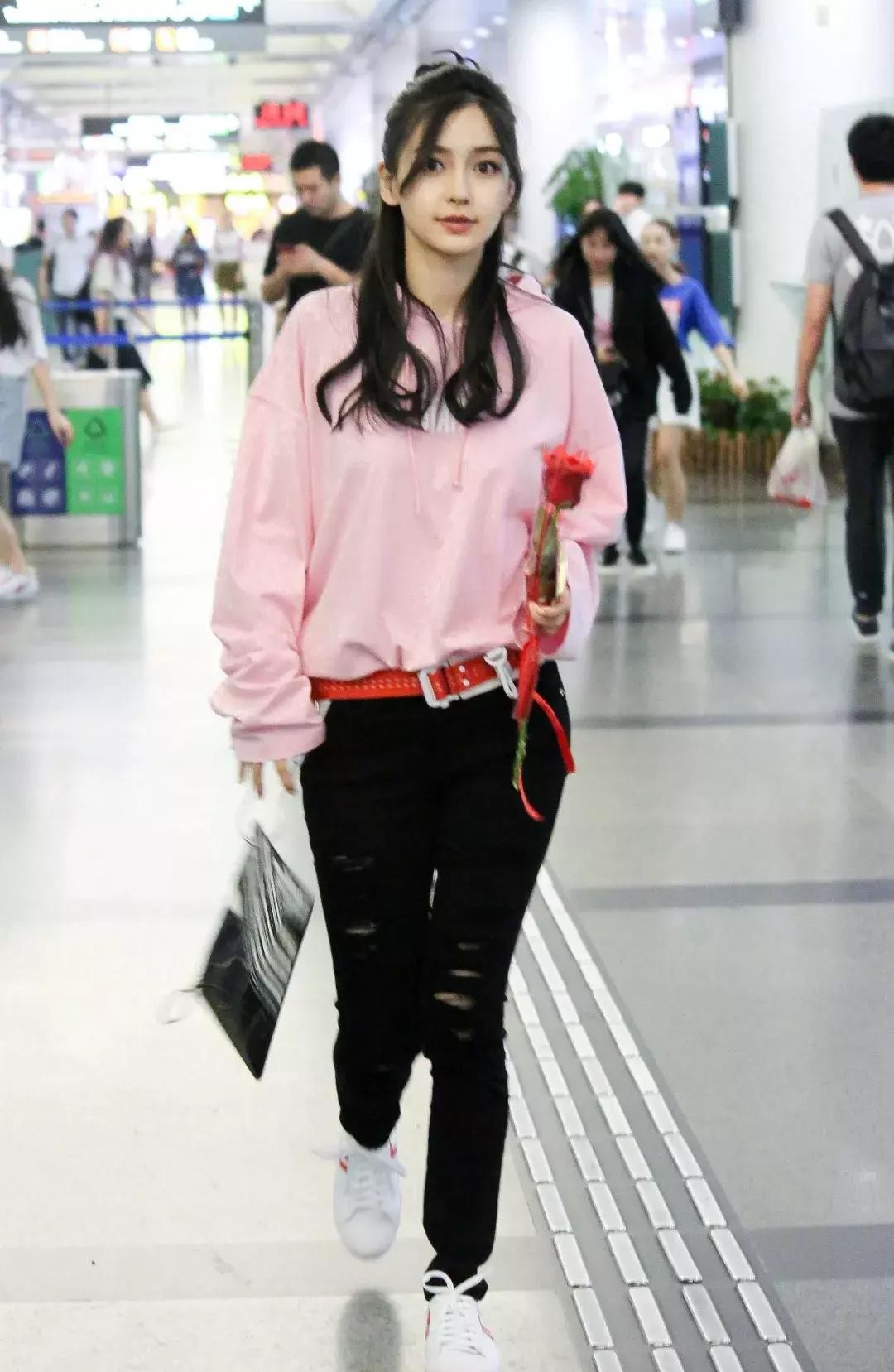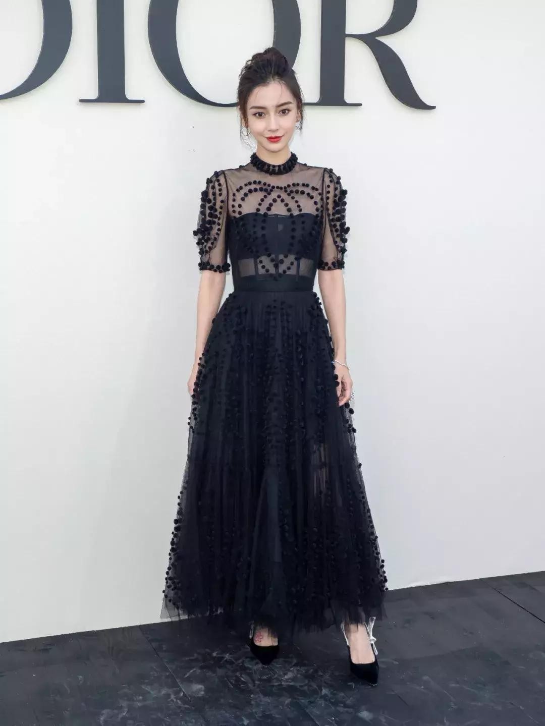 这种款型的连衣裙也成了Angelababy每次出现的标配,很能遮盖身材,让人的目光只停留在纤细的腰部。