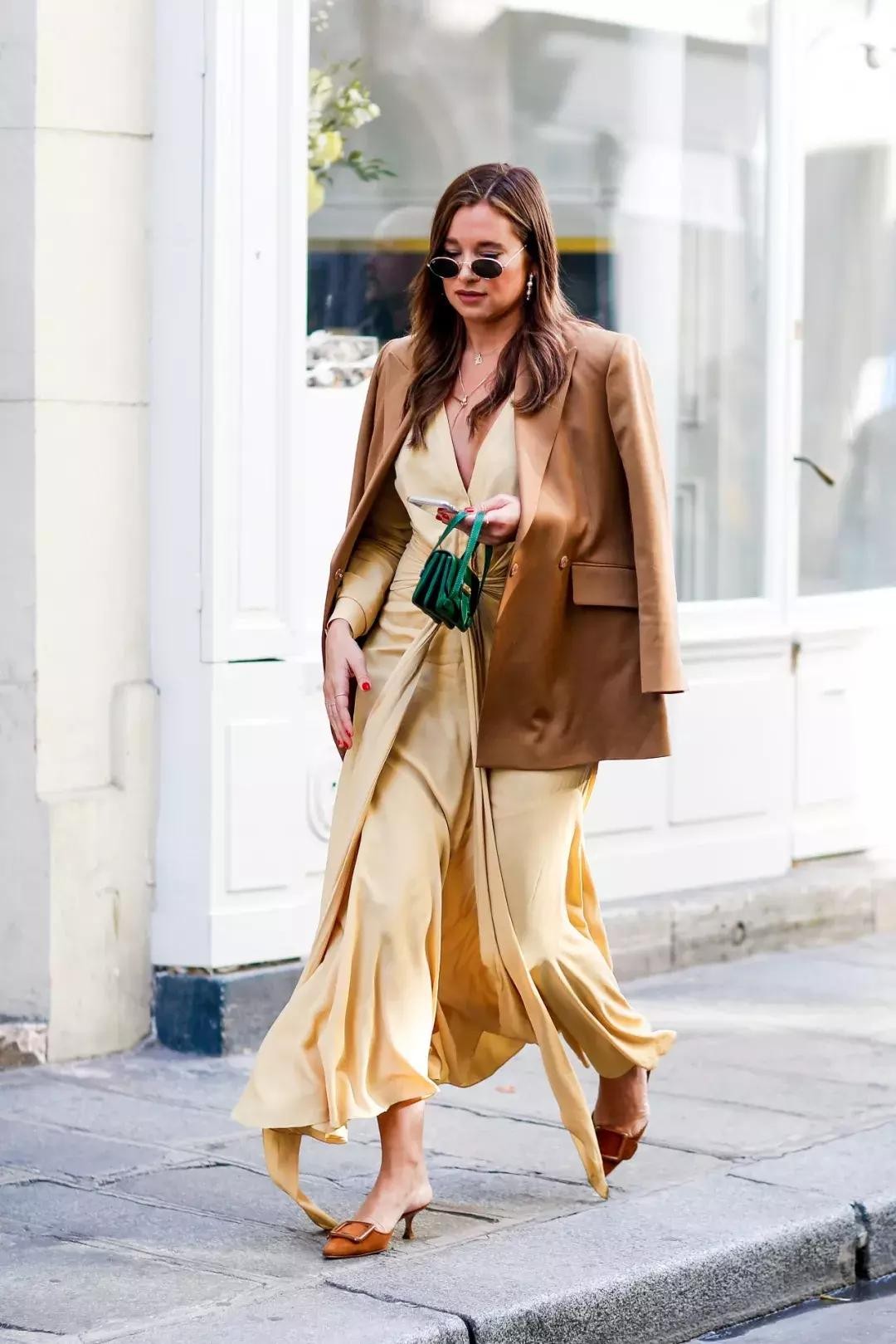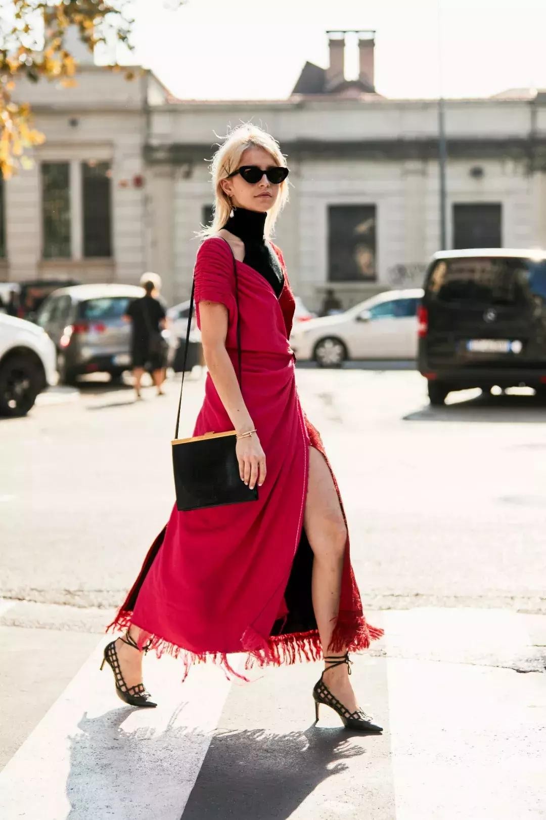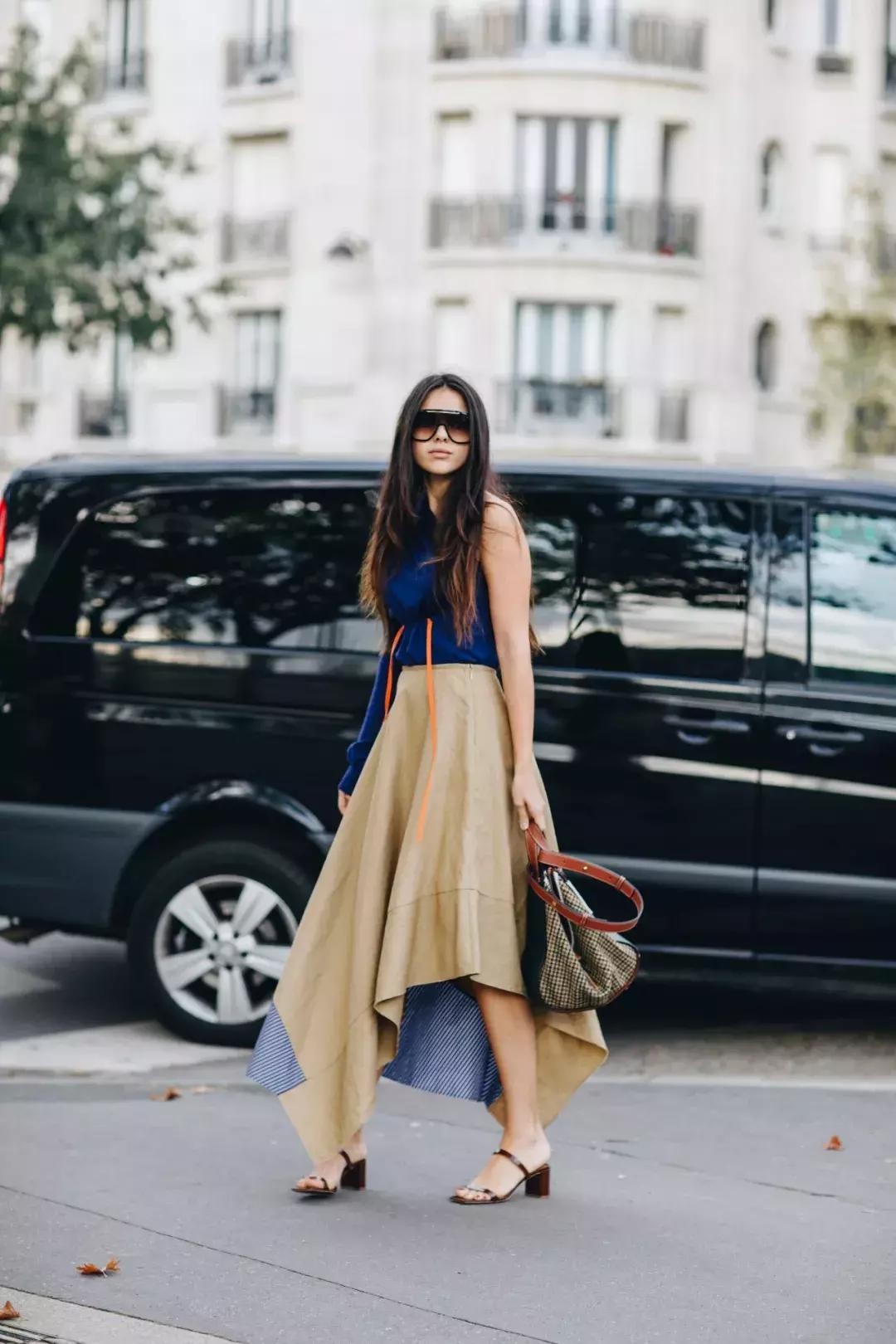 这一季开叉裙持续盛行,“小壮腿”女性也可以适当穿着,但一定要记住下摆要选择微微散开的程度,像博主Caroline Daur这样不规则剪裁的细节感当然会更加显瘦时髦。