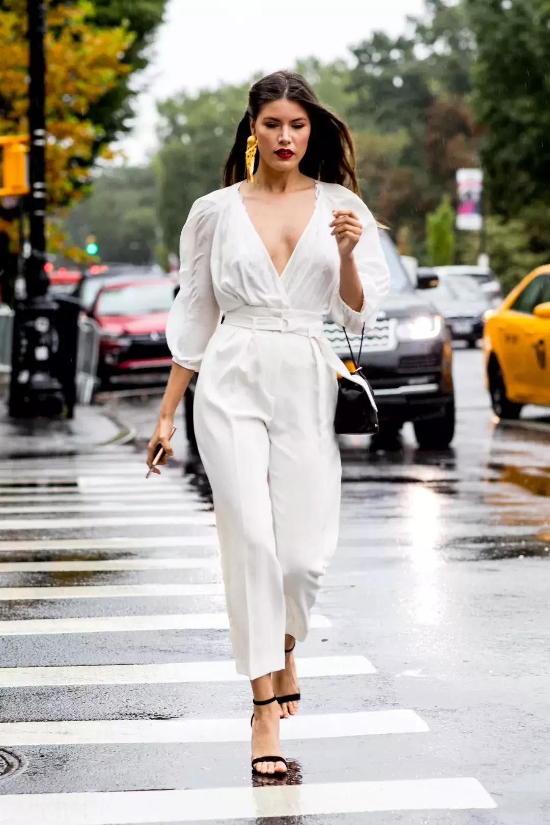 假胯宽的女生穿紧身裤容易暴露腿部曲线,让胯宽更明显,所以紧身裤基本上不用考虑。连体的工装裤宽松的版型就很适合腿型不完美,或是微胖的女生来穿着,上松下松,腰部收紧,只需要把胸口或是脚踝、手腕露出来,就像是“轻”了十来斤。
