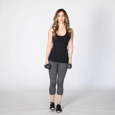 1.首先站直,双脚并拢,手中拿好哑铃。