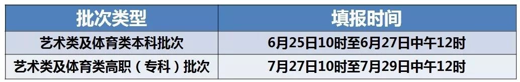 艺术类、体育类考生分两次分别填报本科、高职院校志愿,时间安排如下:
