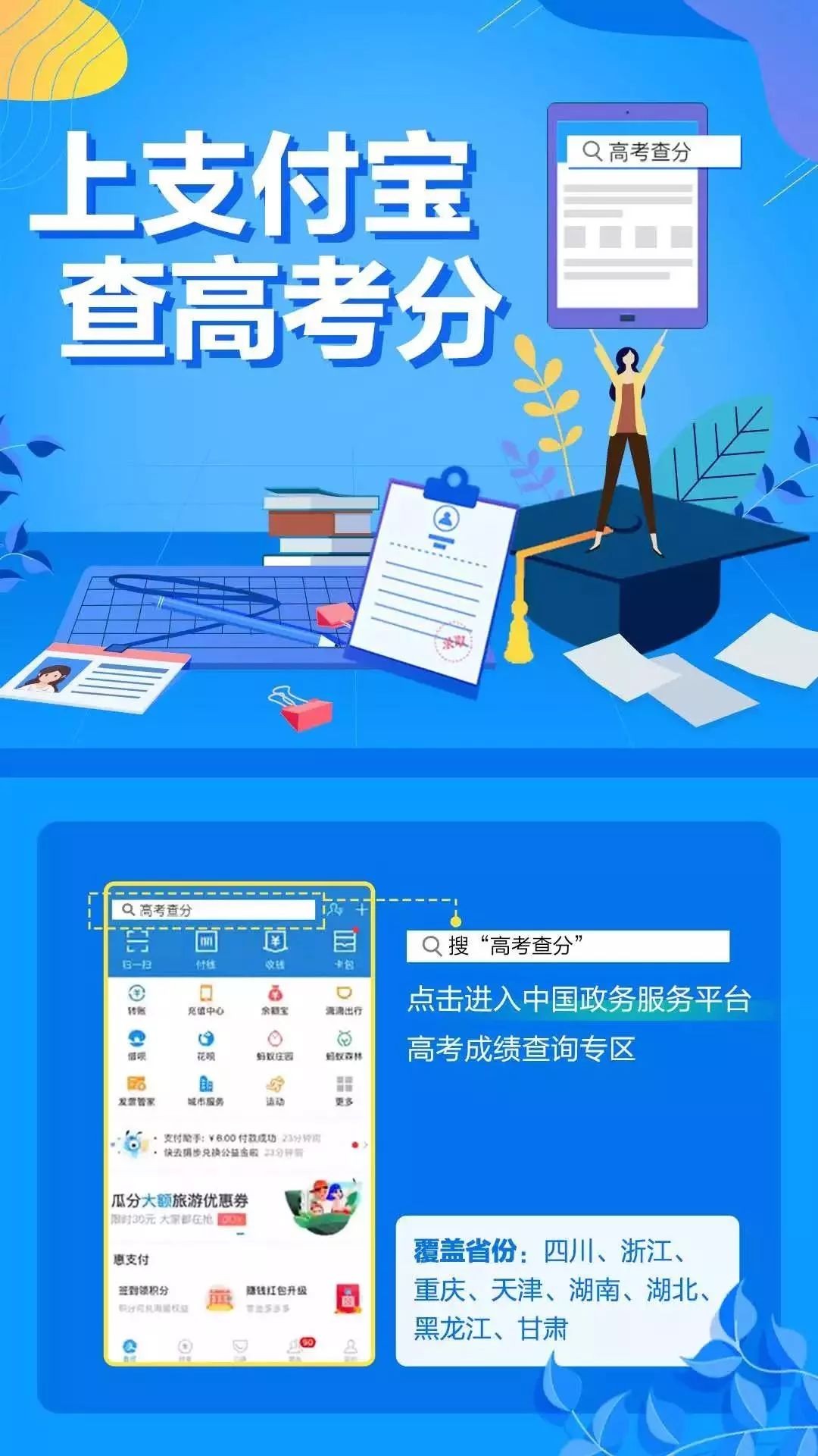 打开支付宝,搜索“高考查分”进入中国政务服务平台高考成绩查询专区,按要求输入准考证等信息即可。中国政务服务平台由国务院办公厅主办,是一个全国性、跨区域、跨部门的网上办事平台。