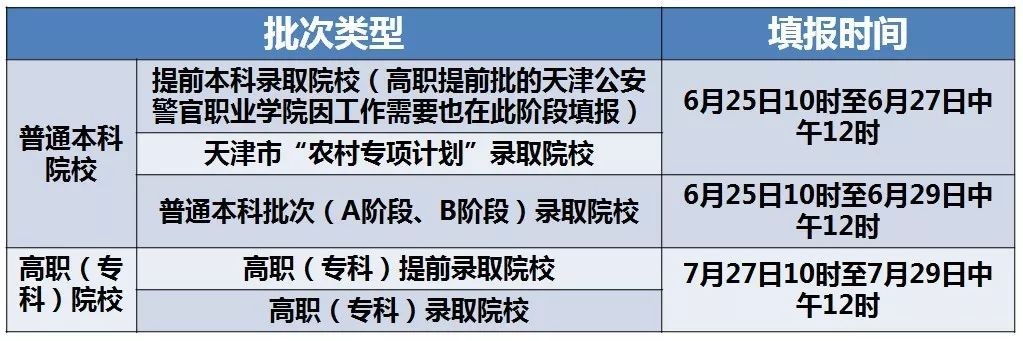 具体为:6月25日10时至6月29日12时,考生填报普通本科及以上批次高校志愿(27日12时前,考生填报提前本科批次志愿、天津市“农村专项计划”批次志愿;29日12时前,考生填报普通本科批次A、B阶段高校志愿)。