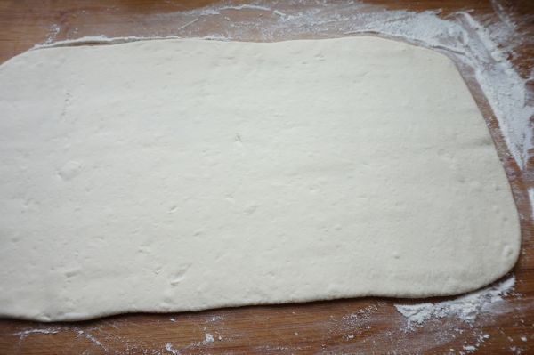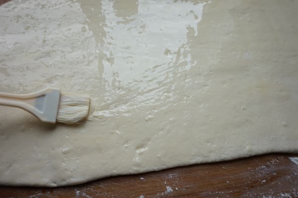 6、醒好的面擀成3毫米左右厚度的长方形面片。涂抹一层食用油。