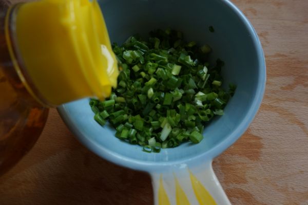5、香葱切碎,用适量食用油拌匀,用油拌一下可以保持葱的绿色。