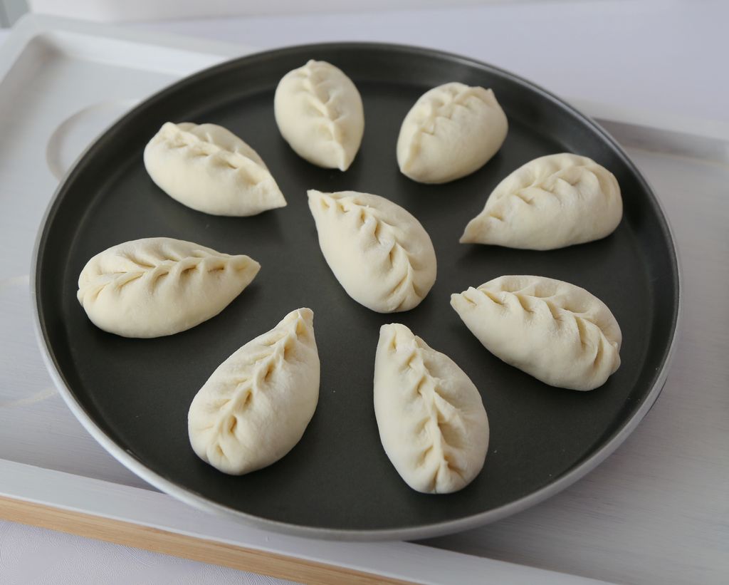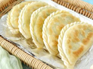 6、韭菜盒子:普通面粉,半烫面,每100g面粉约用65g水。