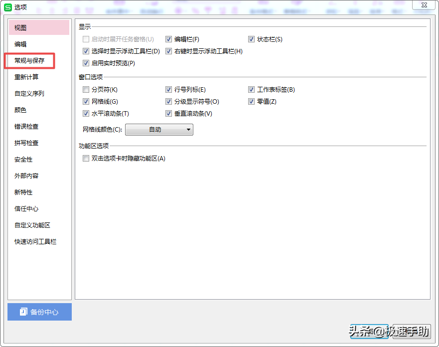 第二步,接着软件就会弹出【选项】的设置窗口,在此界面的左侧,我们找到【常规与保存】选项,并点击打开。