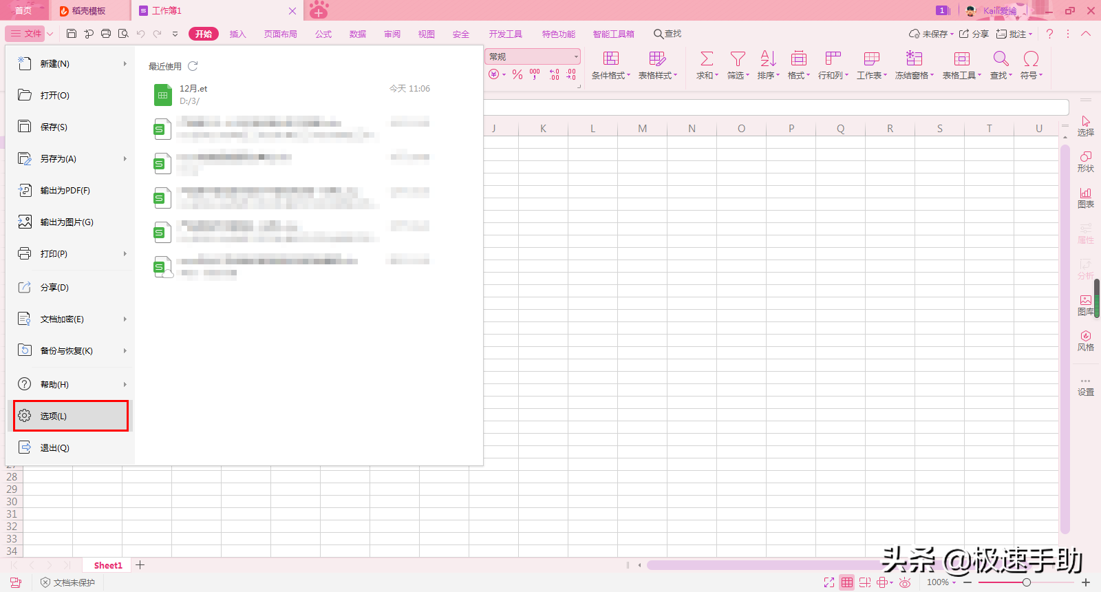 第一步,打开电脑上的WPS表格程序,然后我们找到软件界面顶部的【文件】选项卡,然后在其弹出的选项中选择【选项】功能,并点击打开。