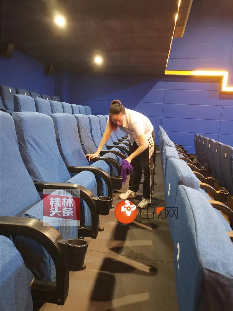 桂林电影院工作人员正在对公共设施进行消毒擦拭