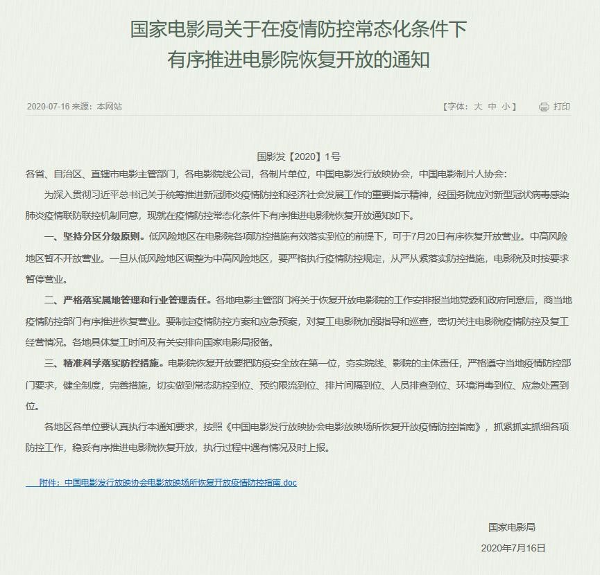 7月16日中午,国家电影局发布《国家电影局关于在疫情防控常态化条件下有序推进电影院恢复开放的通知》,通知内容称 “低风险地区在电影院各项防控措施有效落实到位的前提下,可于7月20日有序恢复开放营业。”