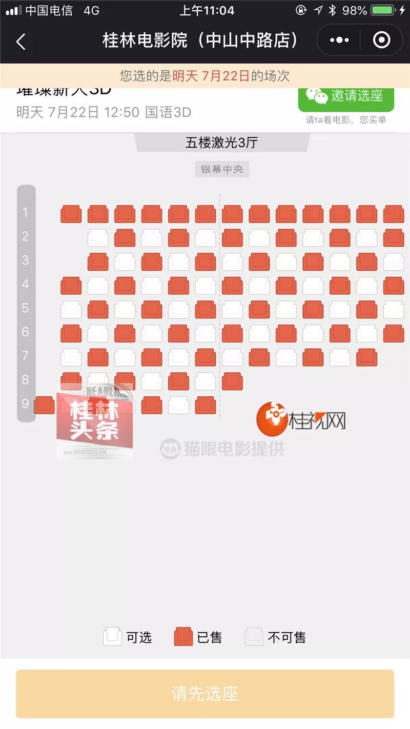 小编发现,桂林电影院已开放7月22日售票通道,网友们可在微信直接购票!同时小编还发现,在购票连接中,每个座位两边的位置是不能选择购票的,都采取了隔座的方式,确保观影安全。