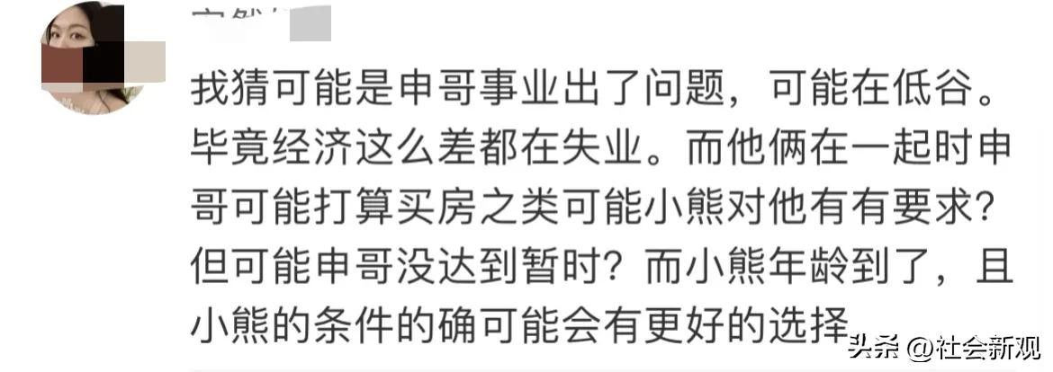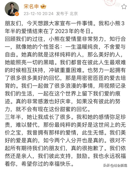 宋名申微博中称和小熊在一起的三年半很开心,一路上相互扶持,留下了很多浪漫的回忆,分手了还是亲人,在心底依旧祝福小熊未来幸福快乐!